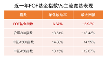 FOF基金通过投资多只不同类型、不同风格、不同基金经理管理的基金,并根据市场变化动态调仓,力争分散市场风险。据Wind数据显示,FOF指数近一年年化波动率为6.67%,最大回撤为-5.92%,相较于沪深300指数、中证A500指数等主流宽基指数整体波动表现更为温和,平滑投资组合风险。