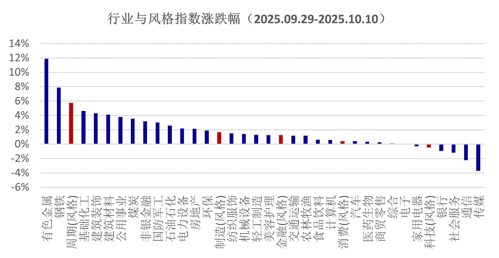 行业方面,在贵金属及工业金属价格的推升下,有色金属行业指数涨幅最高,行业指数上涨了11.89%,其中工业金属和能源金属(申万二级行业指数)分别上涨了13.34%和12.75%,供给端扰动、需求端预期提升,以及美国货币财政政策的影响,均加催化了金属价格。但值得注意的是,在周五特朗普宣布进一步对中国加征关税后,铜、铝的价格都有较大幅度回落,黄金价格则震荡回升。受此影响周期品风格表现整体较强,而科技板块,尤其是通信、传媒跌幅较大。