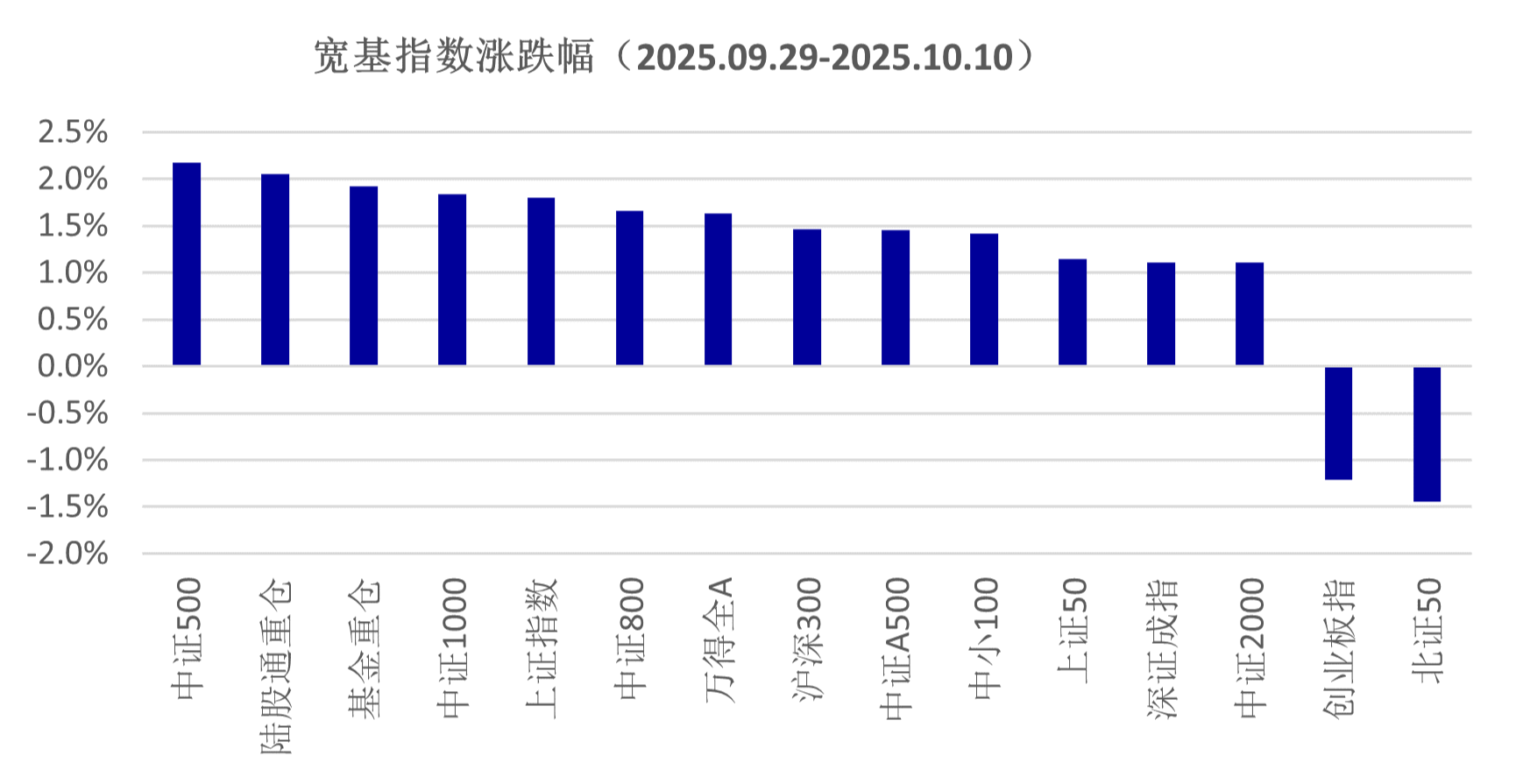 近四个交易日,市场整体呈现上涨,仅上周五出现下跌,但在融资资金波动和中美关系预期影响下,部分板块跌幅较大,例如创业板和科创50指数单日下跌4.55%、5.61%。上证指数也呈现先扬后抑走势,四个交易日上涨了1.80%,宽基指数中中证500和陆股通重仓股指数涨幅最高,达到2.17%、2.05%,而北证50走势与市场背离,呈现震荡回落态势,跌幅也最大,达到1.44%。虽然临近长假,但市场成交活跃,四个交易日万得全A日均成交额达到2.40万亿,而此前一周的日均成交量为2.31万亿,但融资余额小幅回落,截止周五收盘达到2.43万亿。
