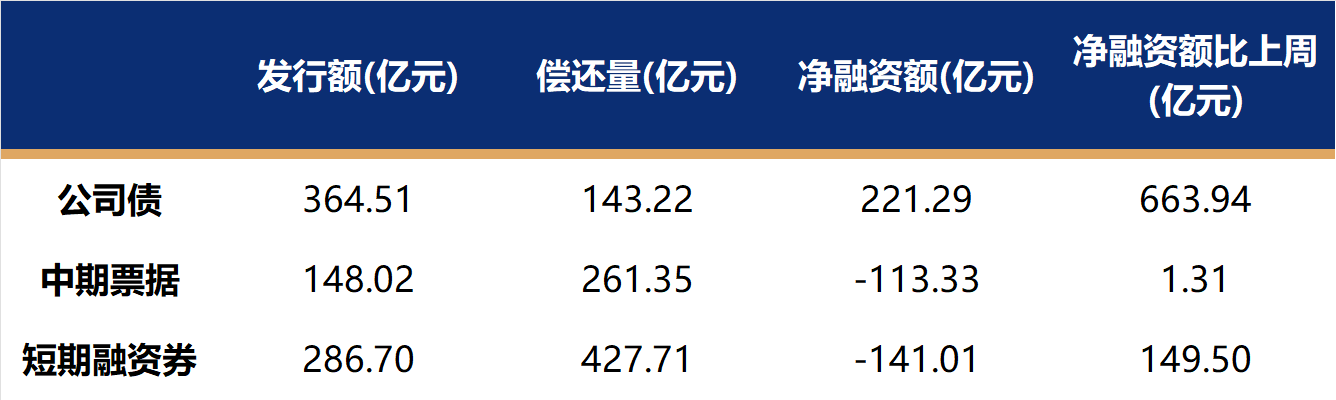 非金融企业短融、中票、企业债、公司债发行量、偿还量、净融资额(与前一周比较)。
