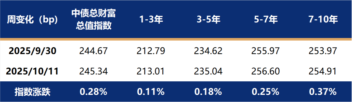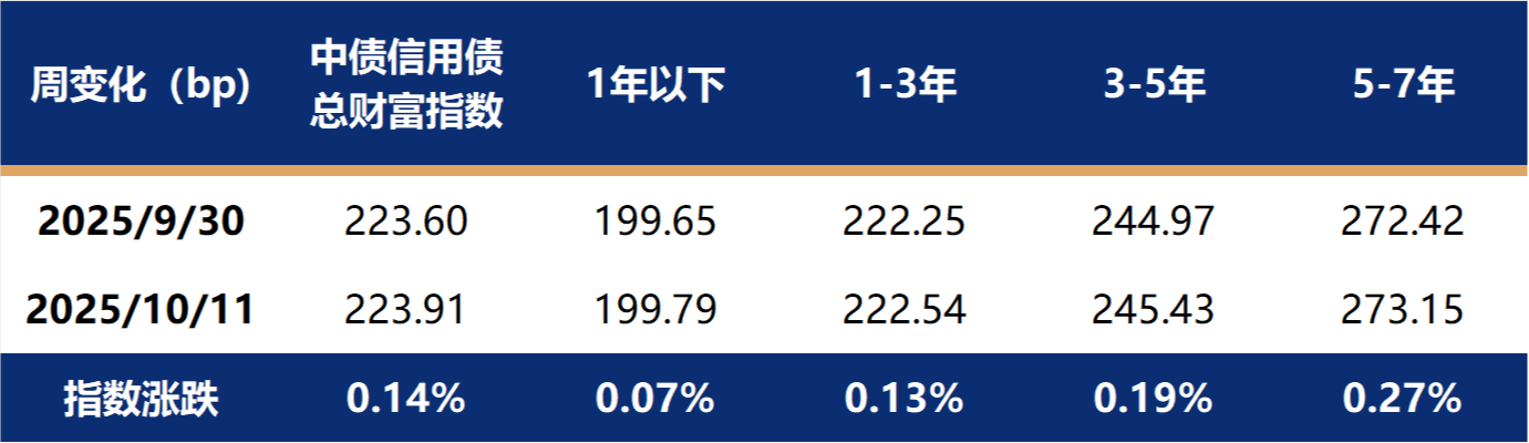 上周,信用债跟随利率债缓慢修复,其中高等级、短久期的信用债收益率持续下行,中债信用债总财富指数上涨0.14%,其中5-7年指数涨幅相对较大。