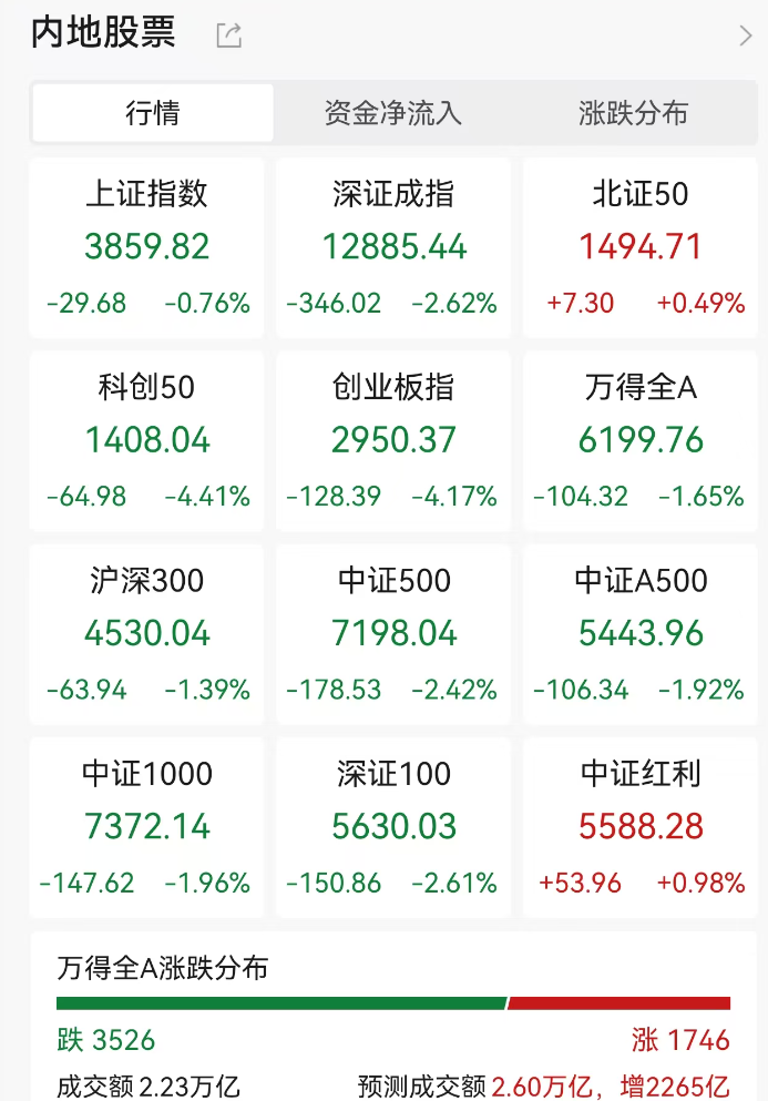 A股市场方面,午后市场整体震荡下行。截至发稿,深证成指跌超2%,创业板指、科创50指数跌超4%,全市场超3500只个股下跌。