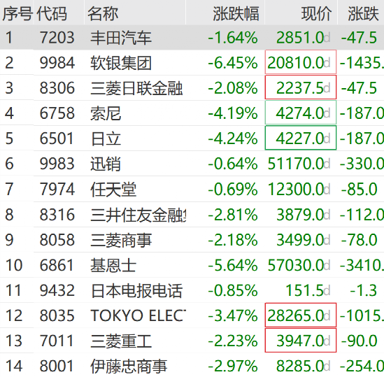 日本市场震荡下行,日经225指数盘中跌超3%。成份股中,软银集团、索尼、日立、基恩士等跌幅居前。