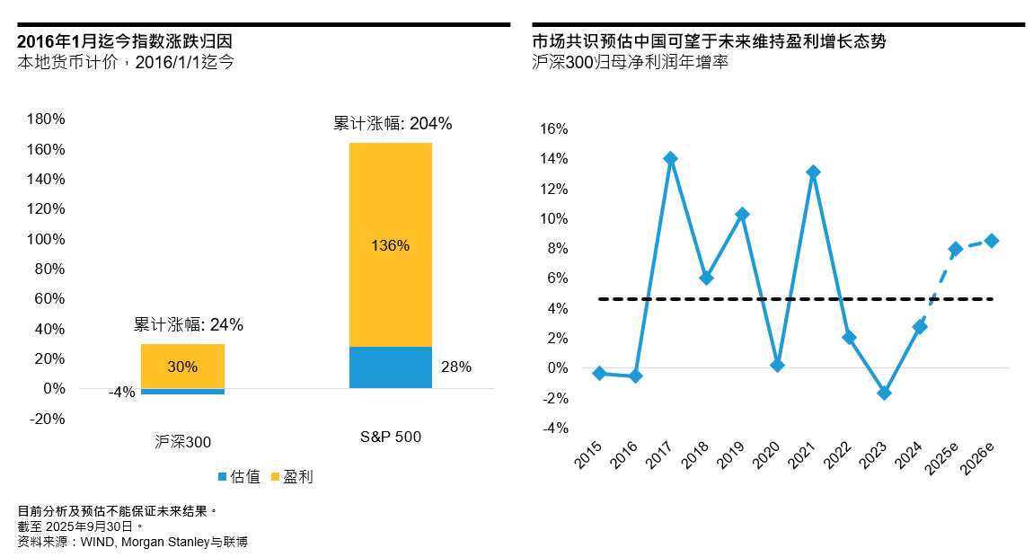 历史表现来看,A股市场的上涨行情往往难以延续。事实上,本次行情已是近十年来第四次持续时间超过150日的上涨周期。而且值得关注的是,过往的中国上涨循环大多由估值扩张驱动,而非由盈利带动。反观美国市场的长期经验表明,持续稳定的盈余增长或许是支撑股市长期走升的关键基石。有鉴于此,我们认为股市长期趋势稳定向上的核心关键之一在于建立更稳定的盈利增长机制。而更稳定的盈利增长,亦能吸引长期投资者投入,进而为估值与市场稳定性提供支持,形成良好循环。