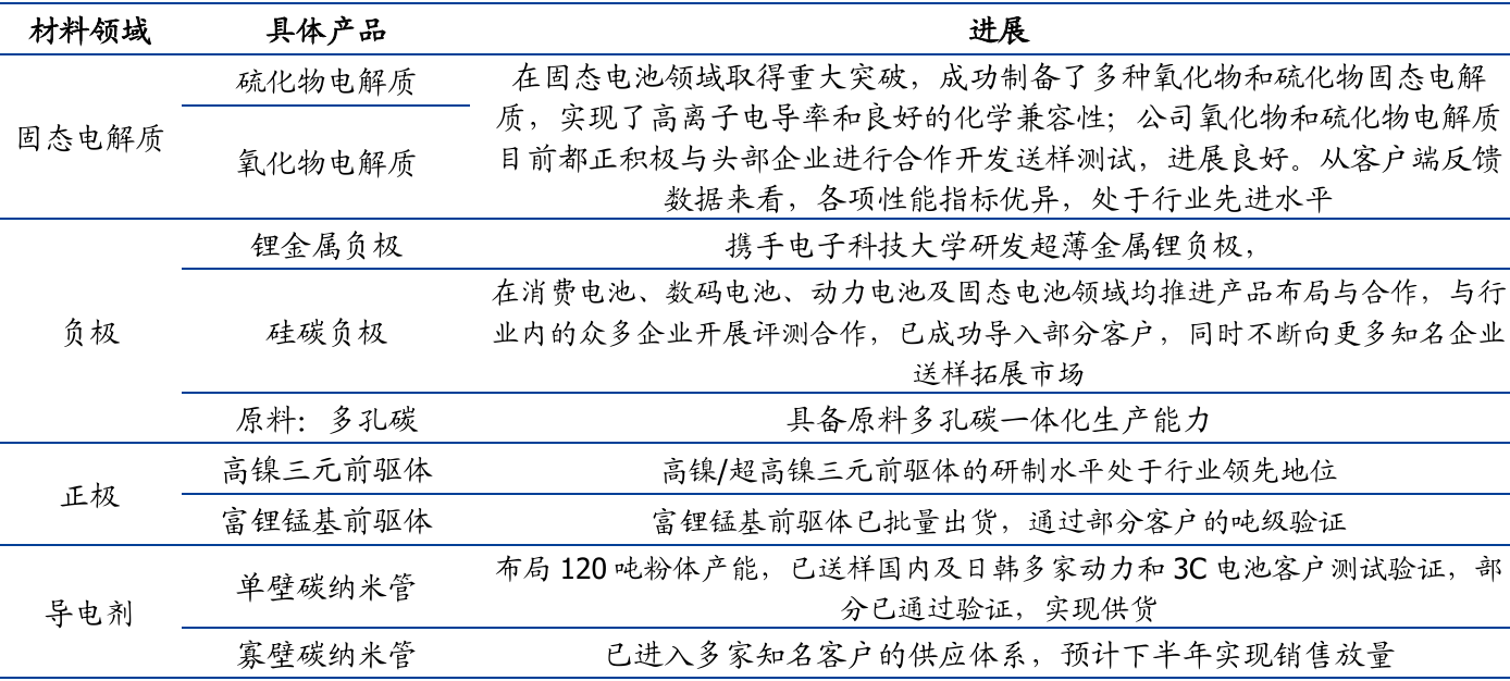 2024年以来,公司持续与行业头部团队合作研发固态电池相关材料。2024年11月11日:公司与芯培森签署战略合作协议,依托芯培森非冯诺依曼架构分子动力学计算系统,加速固态电池材料研发(包括固态电池电解质、碳纳米管、三元前驱体、富锂锰基前驱体、硅基负极、石墨负极等)。