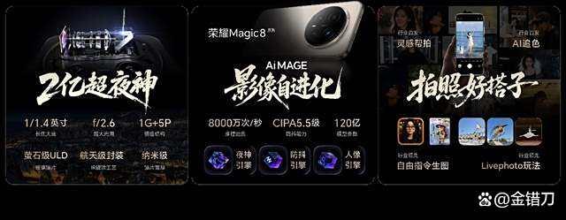 荣耀Magic8 Pro主摄搭载2亿超夜神长焦,采用超大底,超大光圈,顶级镜组结构,并运用行业先进的萤石级镜片玻璃、航天级封装、纳米级镜片镀膜,保障顶级的光学品质。
