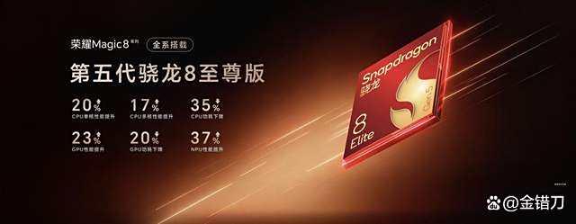 荣耀Magic8全系搭载年度最强旗舰芯片第五代骁龙8至尊版,CPU、GPU和AI算力相比上一代都有大幅提升,性能跑分具有领先跨代表现。荣耀与高通自2022年成立了联合实验室,共同深耕新一代AI与芯片底层技术,针对芯片的各个模块定制专属优化引擎,实现超高芯片使用率。