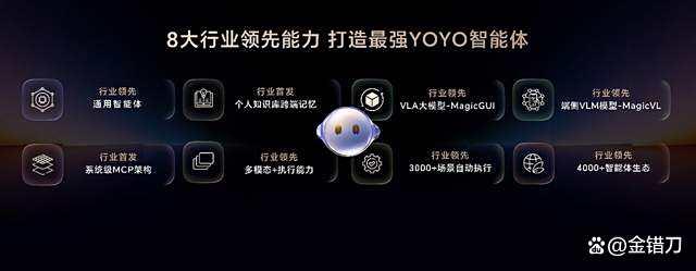 荣耀魔法大模型3.0,具有端云结合的大模型矩阵,在多模态理解、任务规划和工具调用等核心能力上,持续进化,紧密协同,达到比肩SOTA的业界顶尖水平。基于荣耀魔法大模型3.0的YOYO智能体,获得中国信通院L3级卓越型权威认证,代表了当前智能体泛化能力的最高水平。