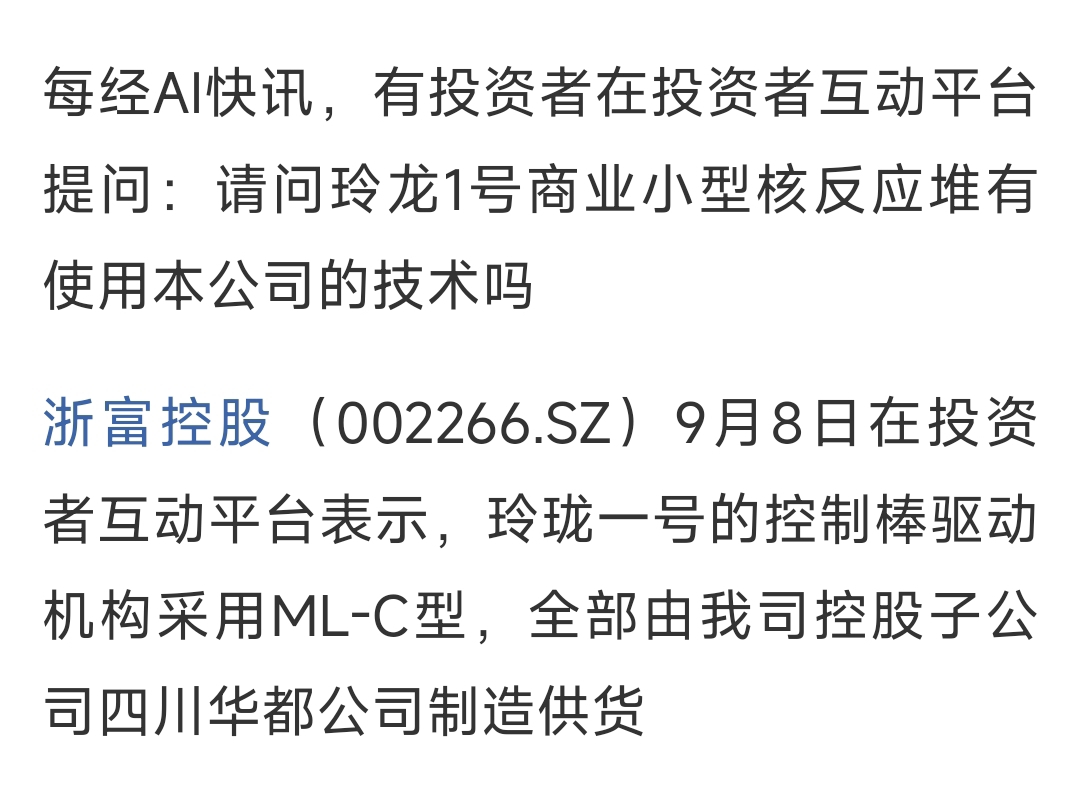 华都核设备是国内唯一同时具备三代压水堆和四代快堆控制棒驱动机构研制能力的民营企业,其技术实力直接支撑了玲珑一号的核心设备需求。作为浙富控股(002266.SZ)与中国核动力研究设计院共同持股的企业 ,华都核设备拥有核一级部件制造资质、民用核安全设备设计/制造许可证等全系列资质,是国内控制棒驱动机构领域技术路线最全面、市场占有率最高的企业之一。
