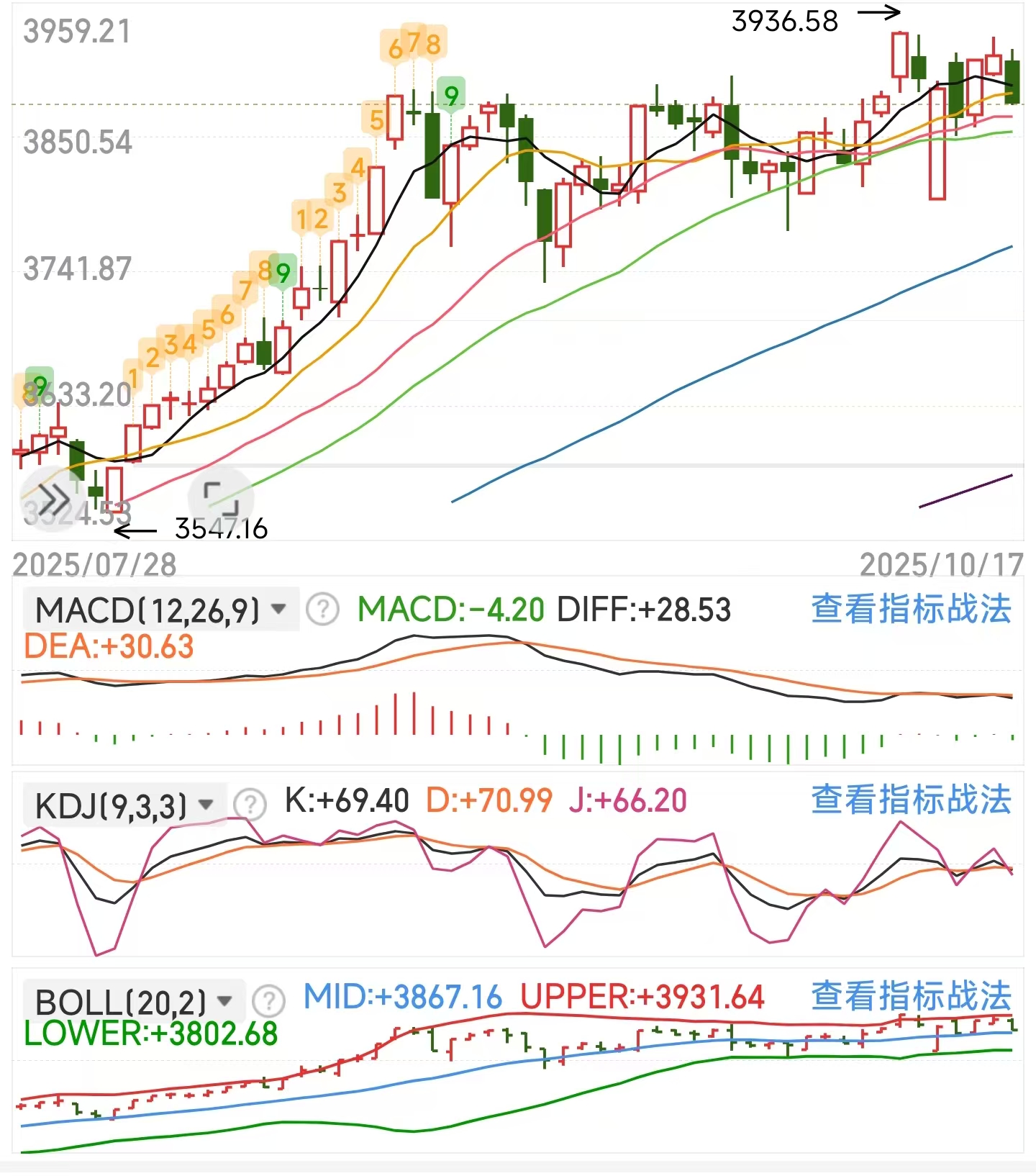 ·日线图:5日、10日、20日均线分别金叉;MACD指标死叉,绿柱扩大,指标线在0轴上方运行;KDJ指标金叉向上收敛,J值探顶拐头;BOLL通道开口收敛,股指在中轨上方运行。