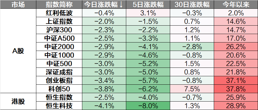 市场全天震荡调整。核心宽基指数悉数下跌,红利指数、中证红利相对抗跌,科创200、科创100领跌。