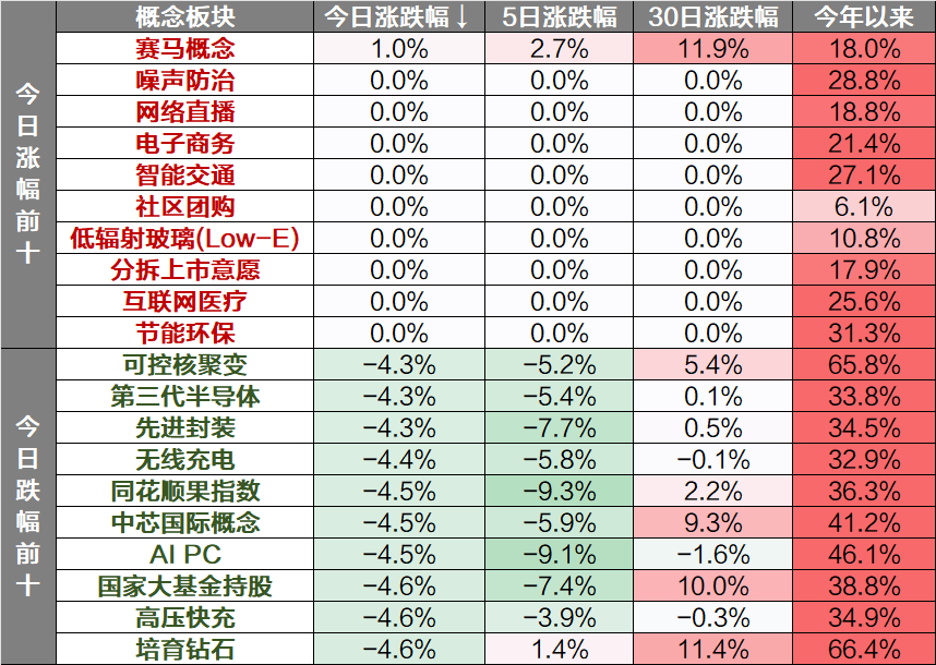 概念主题上看,赛马概念等板块上涨,培育钻石、高压快充、国家大基金持股等板块下跌。