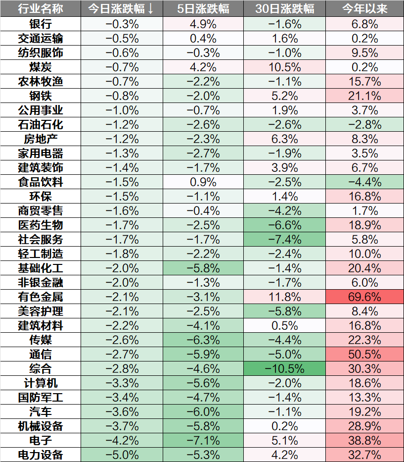 行业上看,银行、交通运输、纺织服饰相对抗跌,电力设备、电子、机械设备等板块下跌。