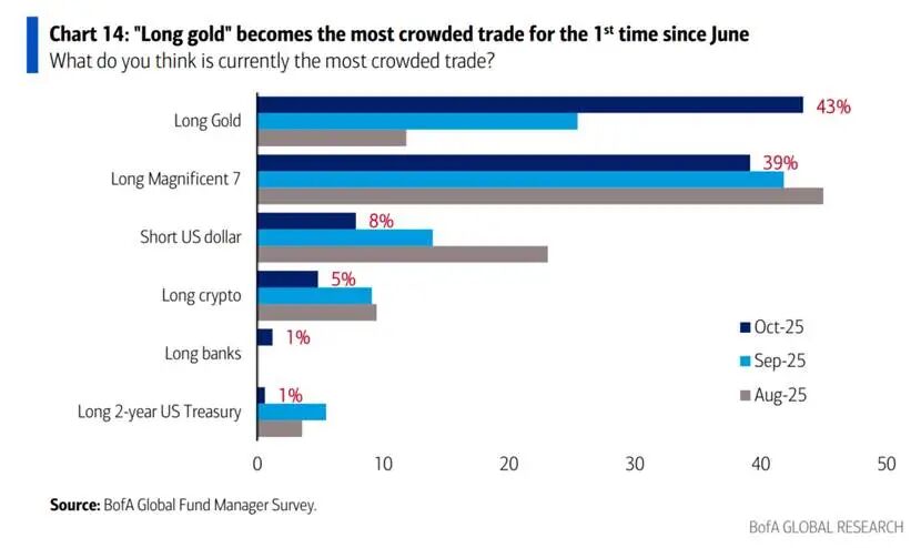 从交易层面上看,根据本周美银发布的10月全球基金经理调研统计,黄金成为了当前最拥挤的交易,而从仓位上看,39%的基金经理现在的黄金仓位是0%,19%的人是2%,16%的人是4%,受采访者中接近3/4的基金经理黄金仓位在4%以下,处于极低的水平。