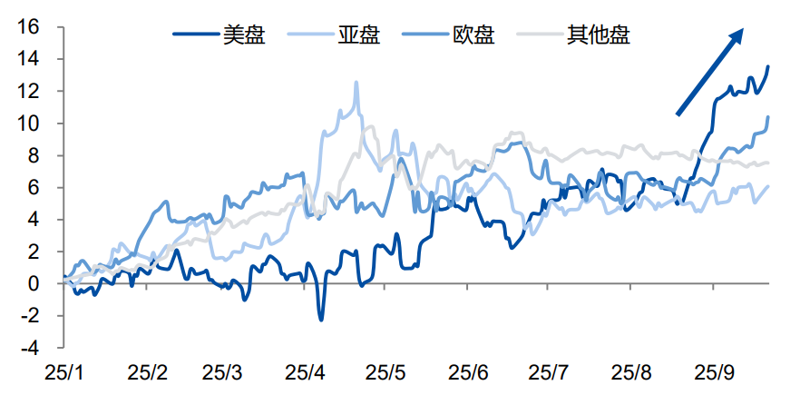 财通证券将黄金价格上涨幅度按时段拆分,也发现:自8月起,金价上涨时间段主要集中在美盘交易时段,欧盘交易时段价格上涨也比较显著,亚盘时间段价格较为平稳。这意味着欧美市场可能是金价上涨的主要推手。