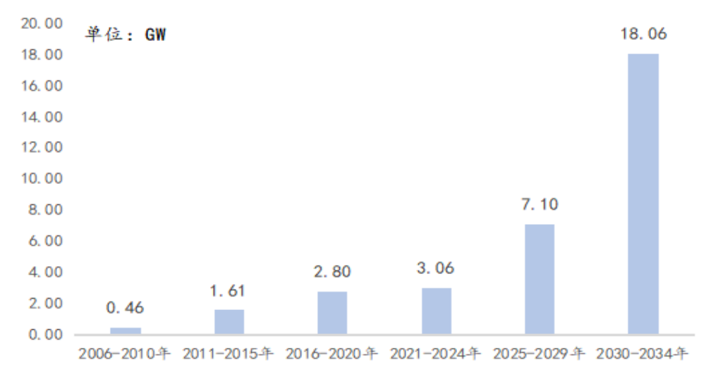 图片说明:2006年~2034年年均装机量呈现加速上升趋势,数据来源于大金重工公告