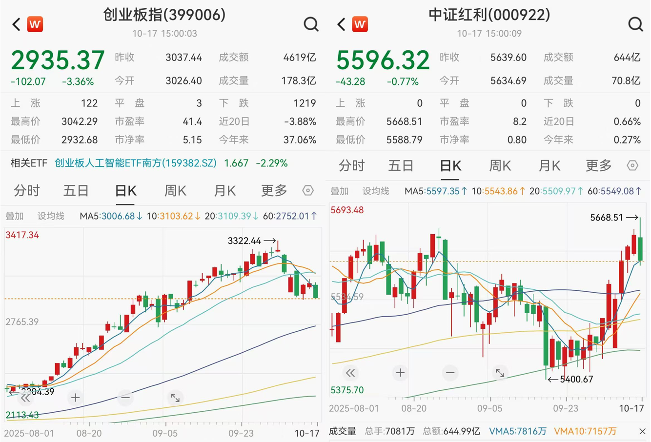 如果用创业板指数来模糊地描述“小登”资产,那么就可以用中证红利指数来模糊地描述“老登”资产,因为这两者在市场波动率大幅上行阶段期间,总是存在着一定的负相关性。截止到10月17日,10月份以来创业板指数已累计下跌9.35%,接近一个跌停,而中证红利指数逆势上涨了2.48%。