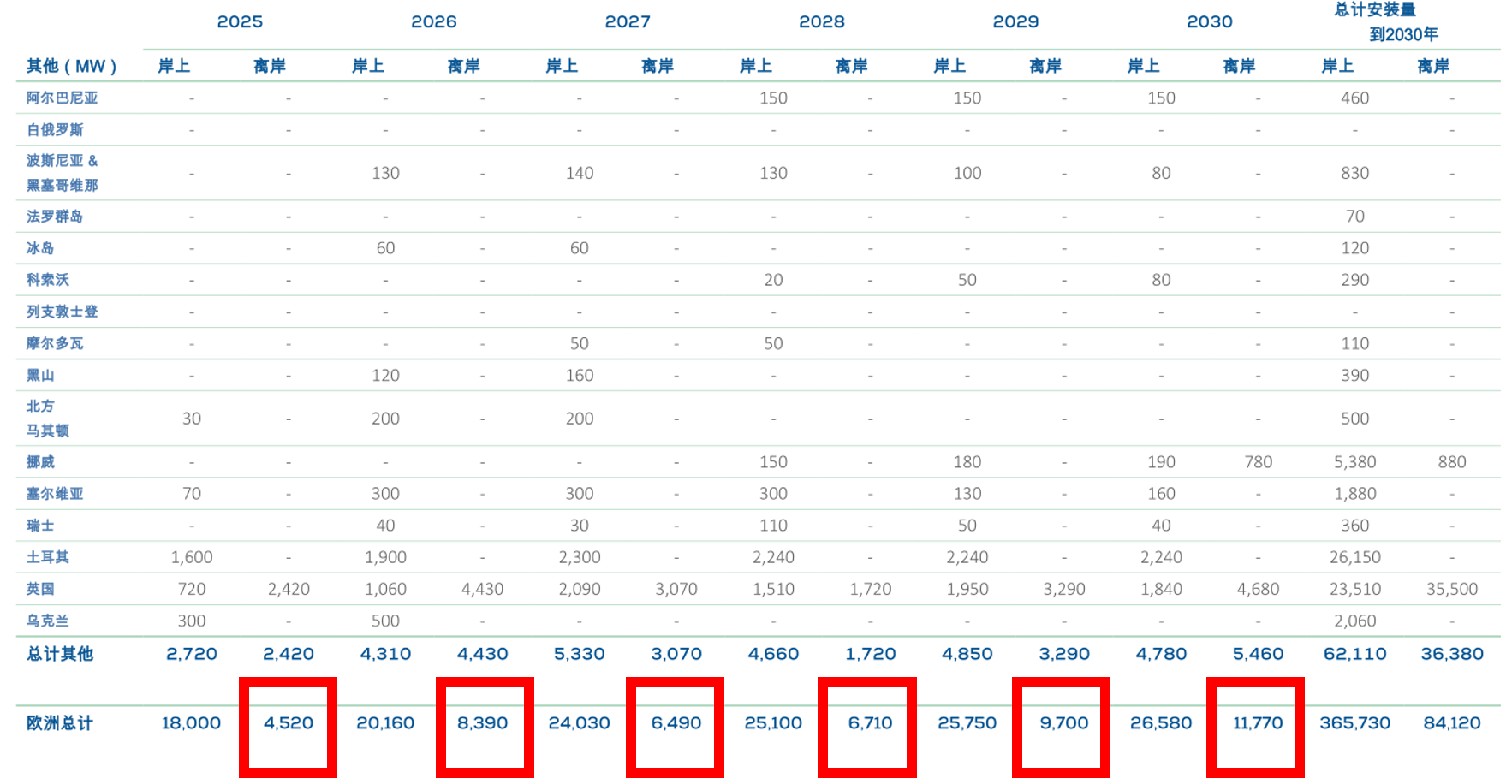 图片说明:2025年~2030年欧洲装机量预测明细,数据来源于Wind Europe