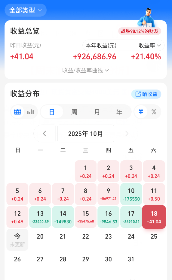 十月份才开始一周,大部分人已经把一个月赚的全部亏完,甚至有说今年已经开始亏损的,A股是这样的,最近跌的主要是科技板块,科技板块弹性大,都是几天能把一个月跌完,这个其实没啥说的,因为每个人进场的时间不一样,体感自然不同,盈亏也不同,当下最重要的是保持好心态, 今年大龙基还盈利100万所以抗的住,爱咋咋地地,天塌不下来!有大龙顶着!一起加油冲冲冲!