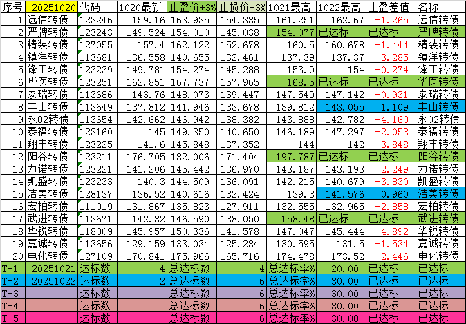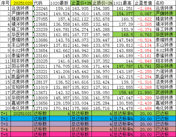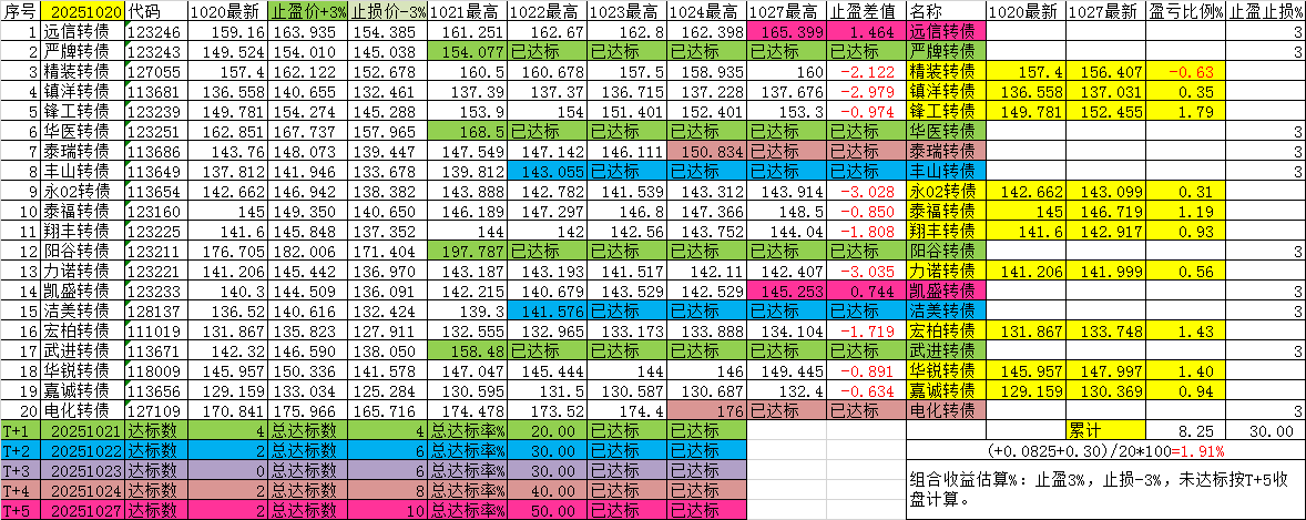 尾盘可转债(短线),每日尾盘14:40后,通过选债公式自动选择一批可转债标的,一周内大于3%收益的概率(五个交易日,以最高价计算)。盘中采用其他方式公布,本平台栏目不便及时发帖。为了计算方便,盘后以当日收盘价作为计算初始数据。