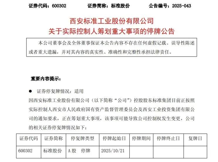 据标准股份公告,公司于2025年10月20日收到控股股东标准集团的通知,其目前正按照实际控制人西安市国资委及西安工业投资集团的通知要求筹划重大事项,该事项可能导致公司控制权发生变更。