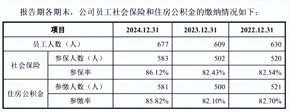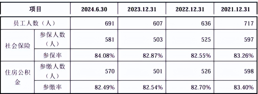 据招股书,2022年及2023年,精创电气员工总数分别为630人与609人,同期社保参保人数为520人与502人,公积金参缴人数则为521人与500人。而第二轮问询回复披露,2022年与2023年公司员工人数分别为636人与607人,社保参保人数分别为525人与503人,公积金参缴人数分别为526人与501人。