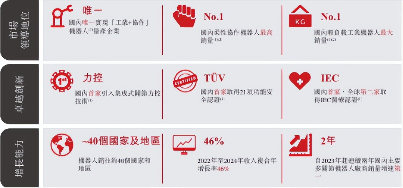此外,灼识咨询报告显示,公司是中国唯一一家能够同时量产工业机器人与协作机器人(两者统称多关节机器人)的企业。按销量计,2024年公司的多关节机器人在中国市场国内制造商中排名第三,在全球制造商中排名第七。自2023年起,在销量增长率方面连续两年位居中国主要多关节机器人制造商之首。