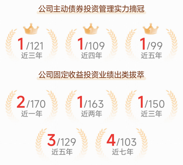 数据来源:主动债券投资管理能力同业排名数据来自中国银河证券《公募基金管理人长期主动债券投资管理能力榜单》,固定收益投资业绩基金行业同类排名数据来自国泰海通证券《基金公司权益及固定收益类资产业绩排行榜》,截至2025年6月30日。