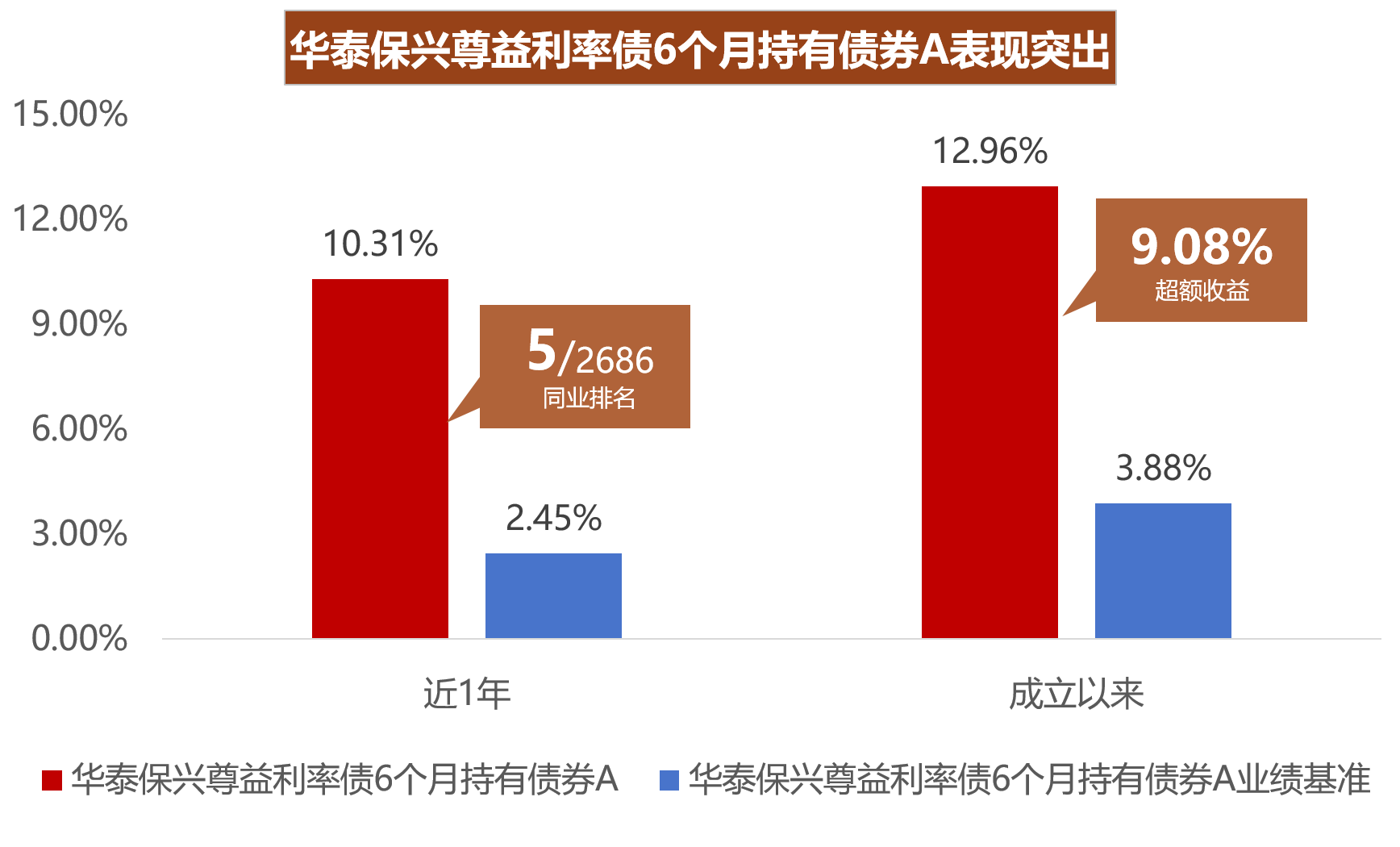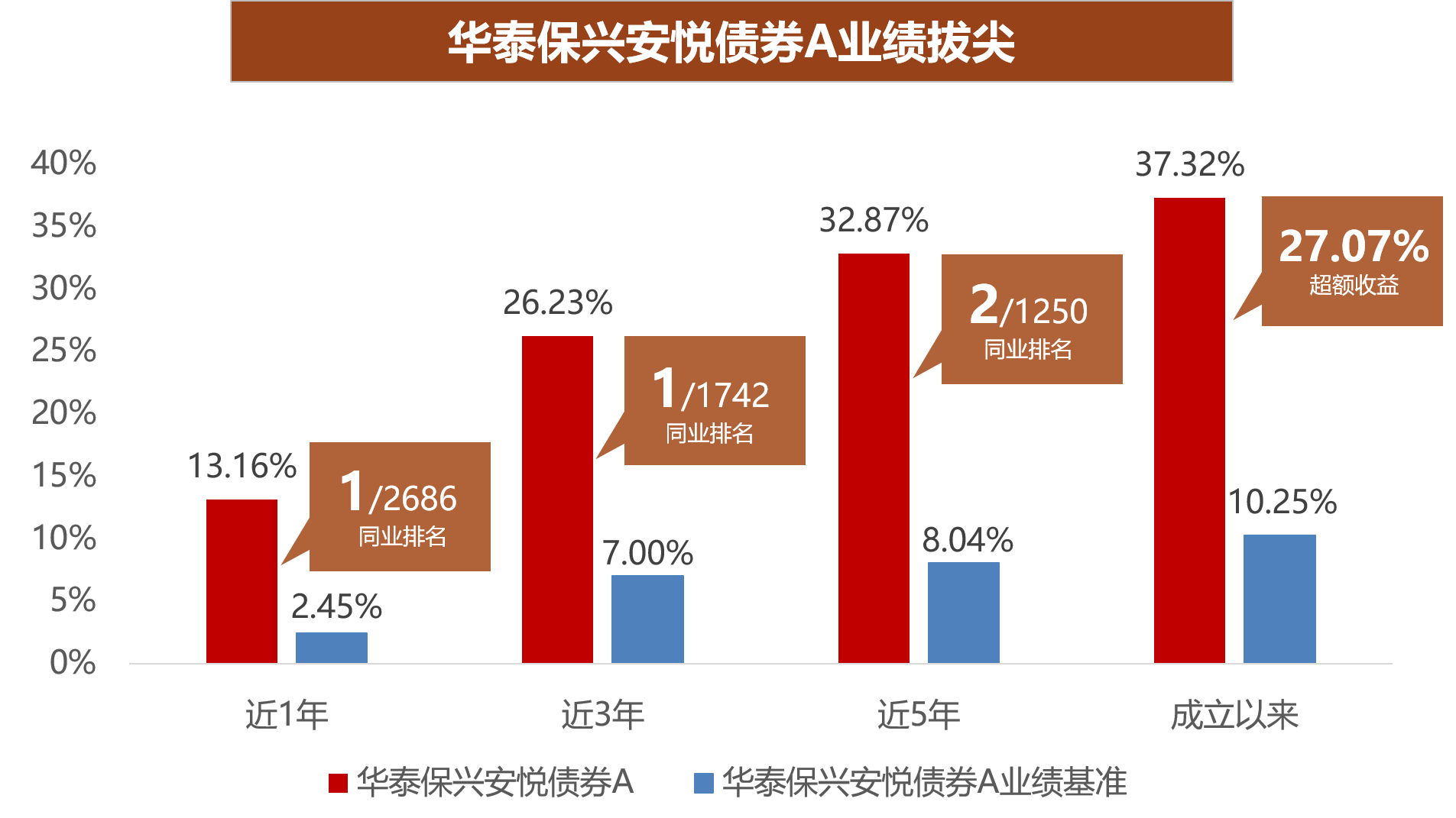 截至2025年6月30日,华泰保兴安悦债券A近1年收益率13.16%,同类排名第1/2686;近3年收益率26.23%,同类排名第1/1742;近5年收益率32.87%,同类排名第2/1250;成立以来收益率达37.32%,较同期业绩比较基准超额收益可达27.07%;同时荣膺国泰海通证券、银河证券三年期、五年期双五星评级。华泰保兴尊益利率债6个月持有债券A自2024年2月6日成立以来累计回报达12.96%,较同期业绩比较基准超额收益可达9.08%;近1年收益率10.31%,同类排名第5/2686。