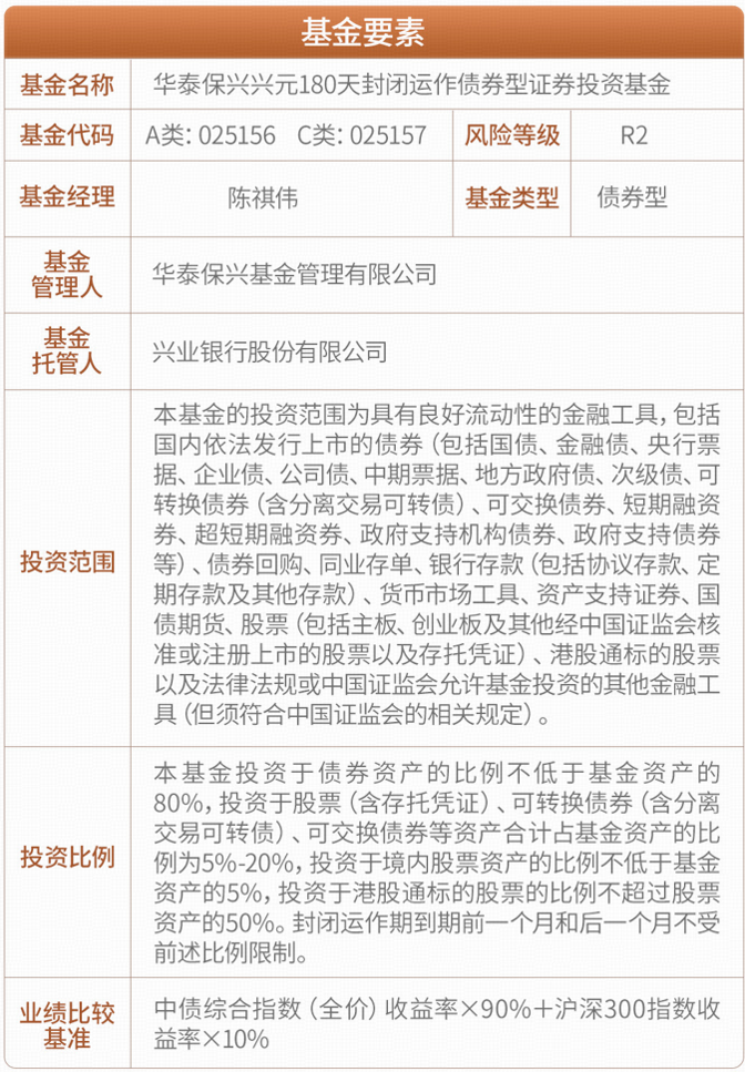 债股双驱、相得益彰,由华泰保兴基金匠心打造的升级“固收+”策略新作——华泰保兴兴元180天封闭运作债券型证券投资基金(A类:025156 /C类:025157)正在火热发售中,这只产品有何特色?基金经理实力如何?小编带你一探究竟。