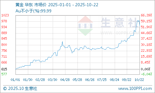 据生意社商品行情分析系统,截止2025年10月22日黄金现货市场价格945.46元/克,较本月初(10月1日)黄金现货市场价格872.11元/克,上涨8.41%,较10月21日黄金现货市场价格986.21元/克,下跌4.13%;月内黄金价格先涨后跌,前期屡创新高,今日高位回落,目前整体价位依旧处于历史绝对高位。