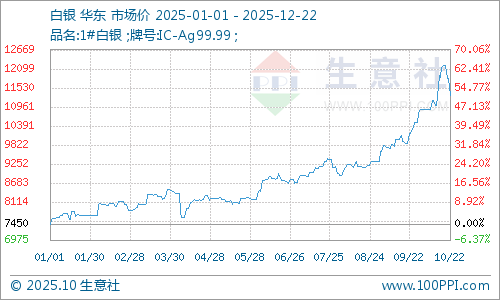 据生意社商品行情分析系统,2025年10月22日白银市场均价11299.67元/千克,较本月初(10月1日)白银市场均价10890.33元/千克,上涨3.76%,较10月21日白银市场均价11891元/千克,下跌4.39%。