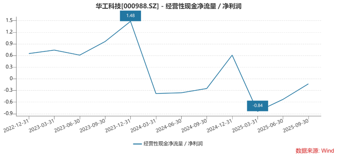 据Wind统计,2024年以来,华工科技的经营性现金净流量与净利润的比率不仅持续低于1,且大多数季度为负值,其最新的2025年前三季度的比值为-0.13。这表明,尽管2024年以来华工科技持续盈利,但其盈利质量堪忧。