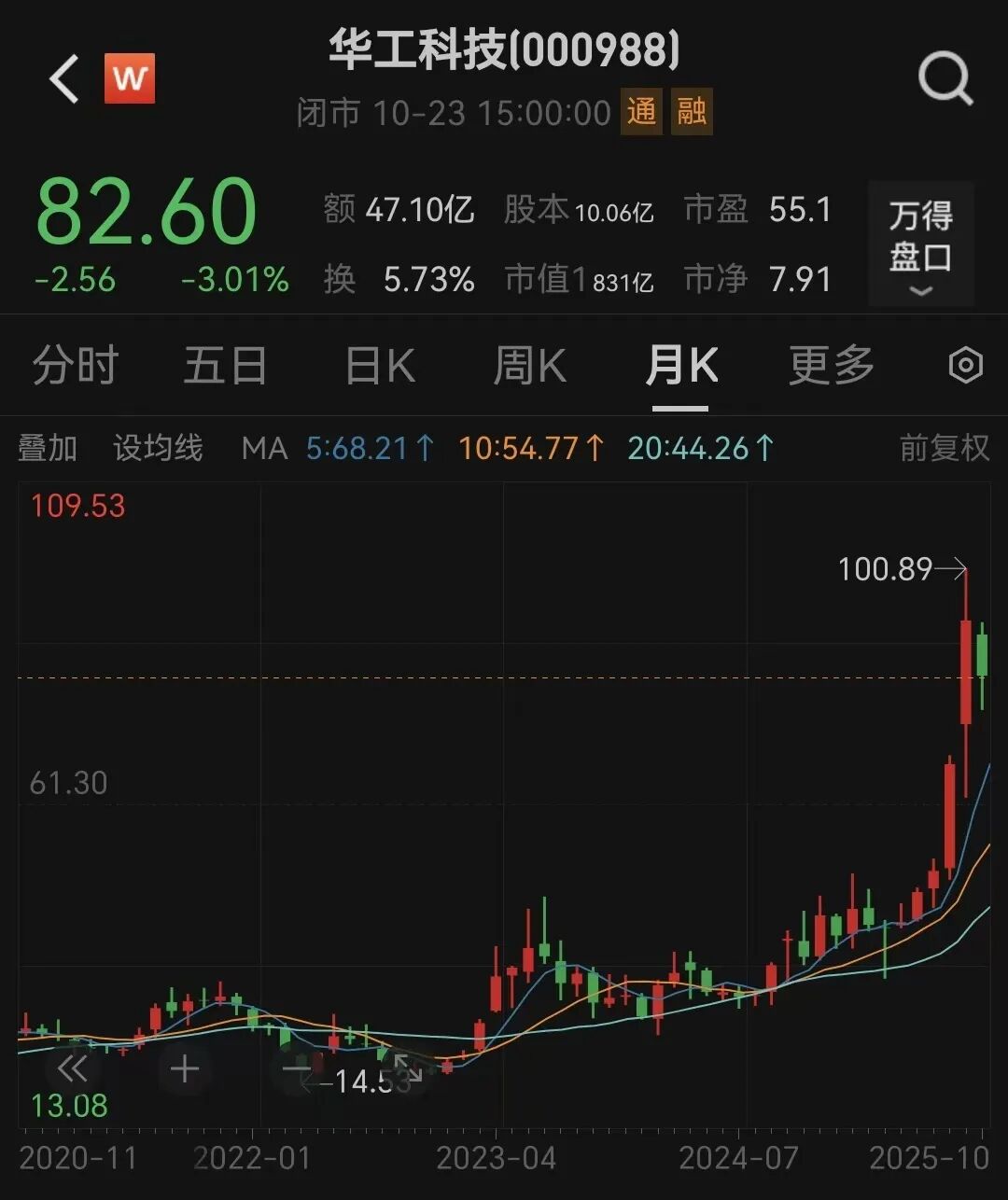 10月23日,华工科技股价以82.6元/股报收,最新市值为831亿元。