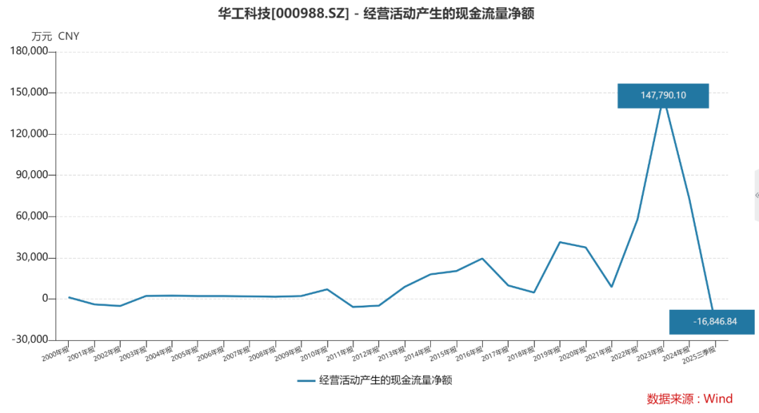 从Wind统计的历史数据来看,自2000年上市至今,华工科技前三季度的经营性现金净流量在2023年三季度创同期历史新高之后,旋即在2024年前三季度末暴跌至-2.35亿元,创A股上市25年来同期最低纪录,且2025年前三季度末该指标为-1.68亿元,依旧在同期第二低位徘徊。