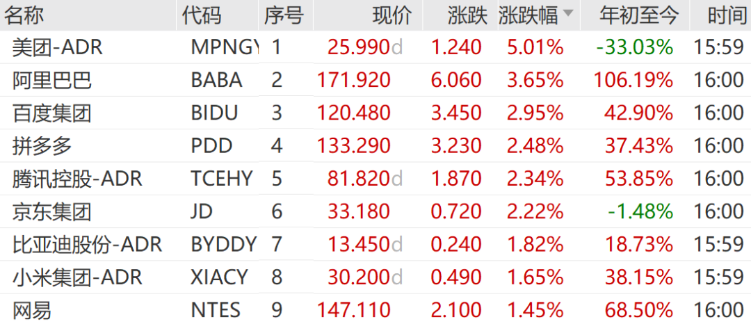 美团涨5.01%,阿里巴巴涨3.65%,百度集团涨2.95%,领涨万得中概科技龙头指数成份股。