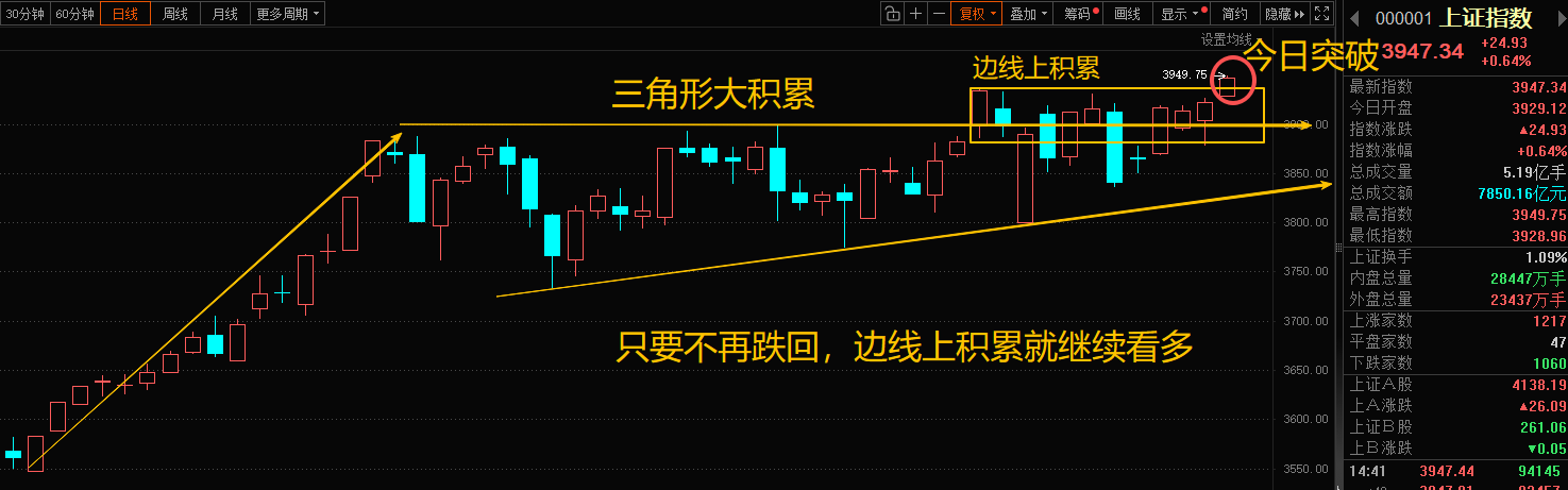 当下市场已经选择了向上突破,那我们就迎接新的行情就好,不过前提是不能再次跌回边线的积累,如果再次跌回,仍然还是保持警惕的,如果没有跌回,那么我们继续看多就好了。