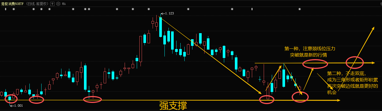 但不管是那一种,这里抄个底胜算都是比较大的,如果是走双底,就看看颈线味能不能突破就好,如果突破这里就还是很好的加仓机会。