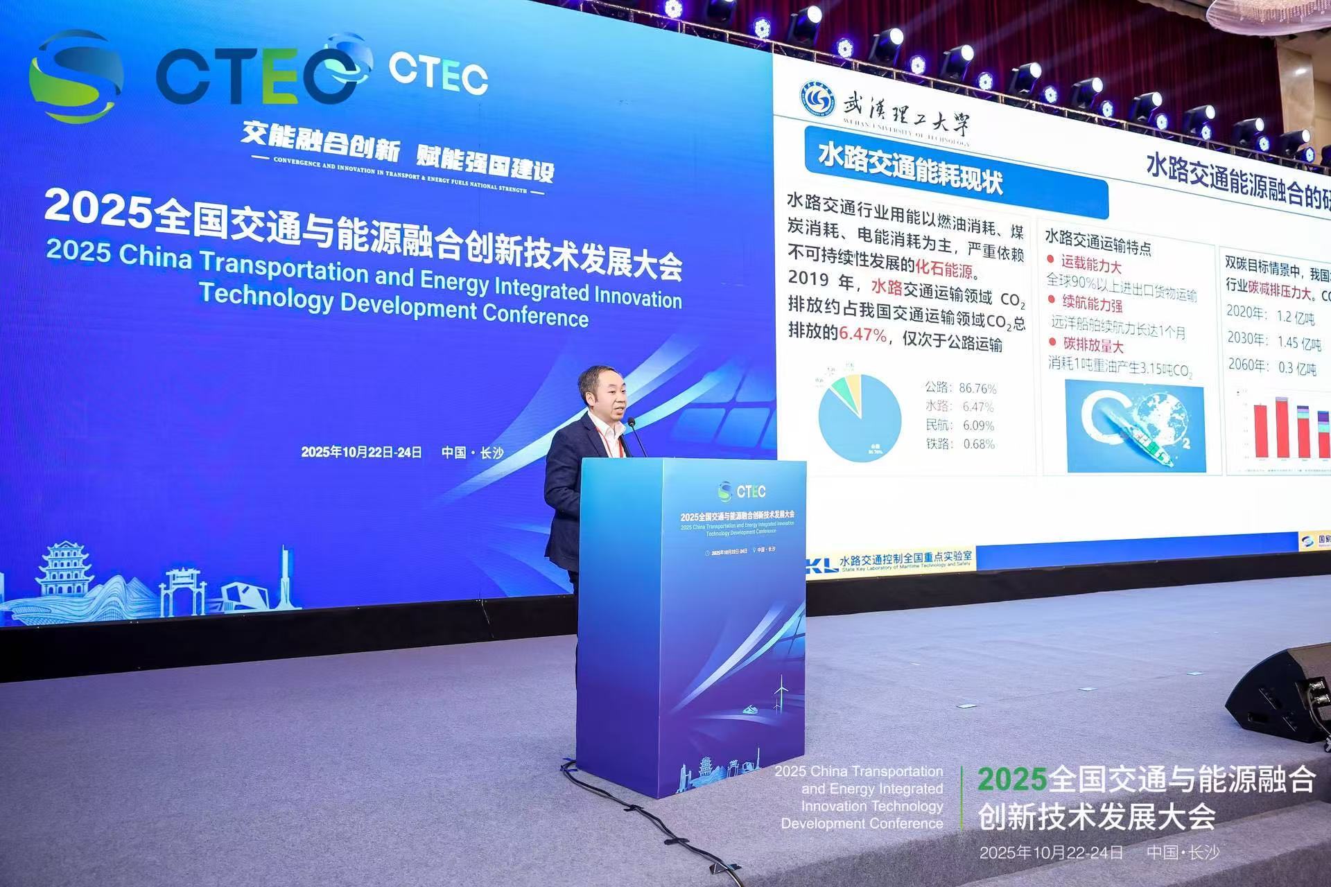 武汉理工大学袁成清教授代表严新平院士作了《双碳战略下的水路交通能源融合及应用实践》的主旨报告。他系统分析了水路交通在能源消耗和碳排放方面的现状与挑战,并介绍了绿色港口、清洁船舶、岸电系统、氢能及氨燃料船舶等技术的应用实践。他提出,应构建“港口-船舶-航道”一体化的绿色能源体系,推动水路交通的全面绿色转型。