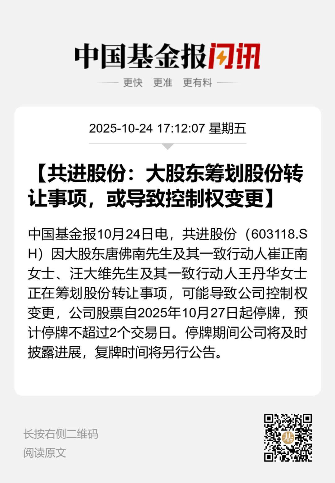 共进股份10月24日盘后公告,公司近日收到大股东唐佛南及其一致行动人崔正南、汪大维及其一致行动人王丹华的通知,其正在筹划有关公司的股权转让事宜,该事项可能导致公司控制权变更。