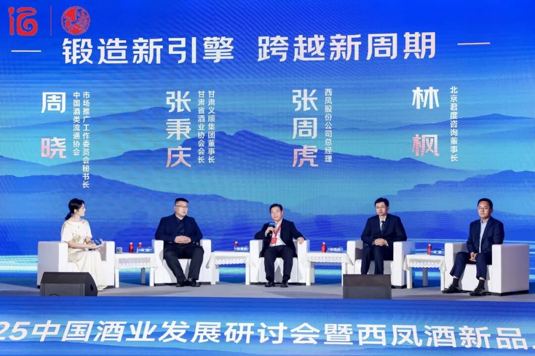 在圆桌论坛环节,中国酒类流通协会市场推广工作委员会秘书长周晓,甘肃省酒业协会会长、甘肃义顺集团董事长张秉庆,西凤股份公司总经理张周虎,北京君度咨询董事长林枫登台,围绕“锻造新引擎,跨越新周期”主题展开对话。