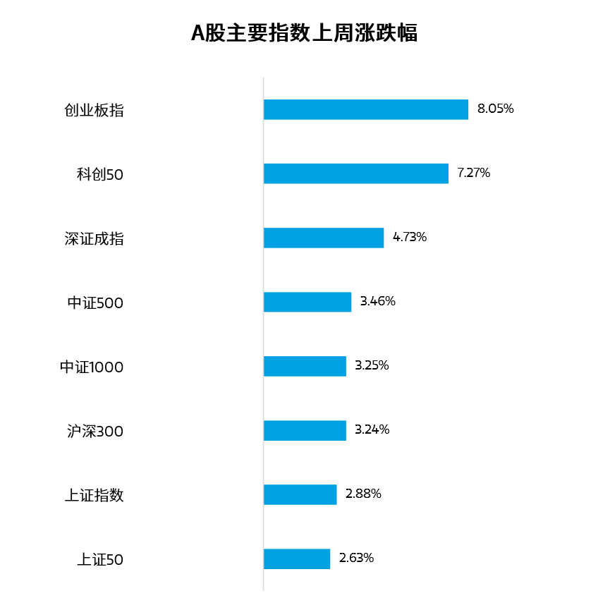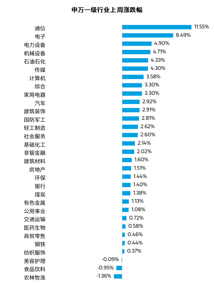 上周A股三大指数全线反弹。截至上周五收盘,上证指数全周上涨2.88%,深证成指上涨4.73%,创业板指上涨8.05%。从上周表现来看,在中美贸易冲突大幅缓和的背景下,叠加“十五五”规划出炉,市场情绪全面转好,以半导体、通信、军工为主的科技板块大幅修复,权重板块的涨势则稍弱。