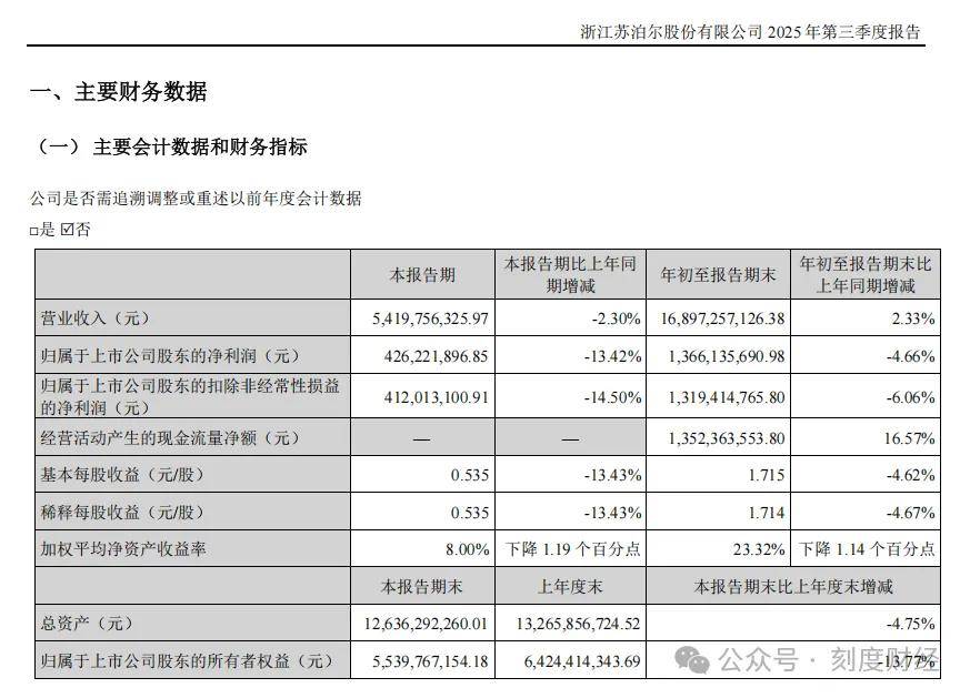 10月23日晚间,苏泊尔最新财报显示,本季度实现营业收入54.2亿元,同比下降2.3%。盈利质量的下滑更为显著,归属于上市公司股东的净利润4.26亿元,同比下降13.42%,扣非后净利润4.12亿元,降幅扩大至14.50%。