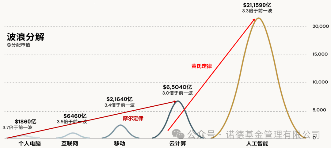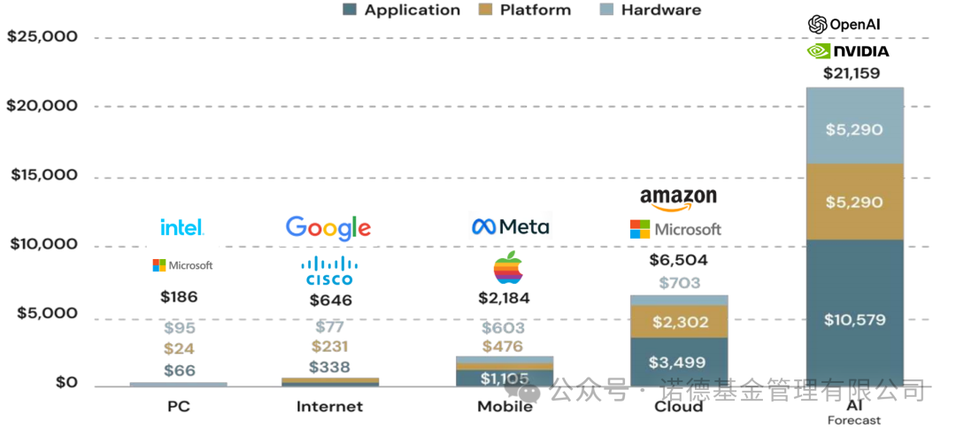 从个人电脑时代1860亿美元的总分配市值,到互联网时代6460亿美元(较前一时代增长3.5 倍),再到移动时代21640亿美元、云计算时代65040亿美元的持续突破,每一轮科技周期的总分配市值均呈倍数级攀升。如今,AI周期的总分配市值已达211590亿美元,规模为云计算时代的3.3倍。