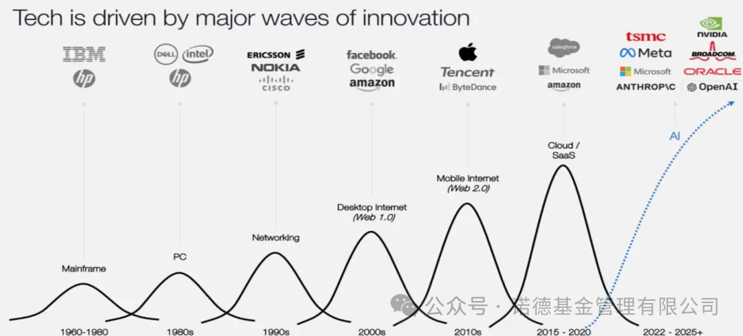 自1960年代至今,科技行业已历经七轮核心周期,每一轮周期均由关键技术驱动,并催生了一批领军企业。过去数十年间,大型机、PC、互联网、移动互联网、云计算先后掀起科技浪潮;而当下及未来,AI或正成为新一轮科技周期的主角。