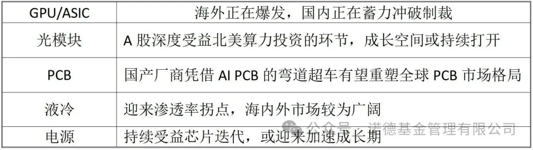 在投资机会方面,主要看好两种类型的芯片:GPU(图形处理器)和ASIC(特定用途集成电路)。这些芯片的投资虽然目前集中在海外市场,但国内市场也在逐步跟进。除此之外,随着AI算力机会的扩散,相关的配套产业,比如光模块、印刷电路板(PCB)、液冷技术和电源设备等,也都值得重点关注。