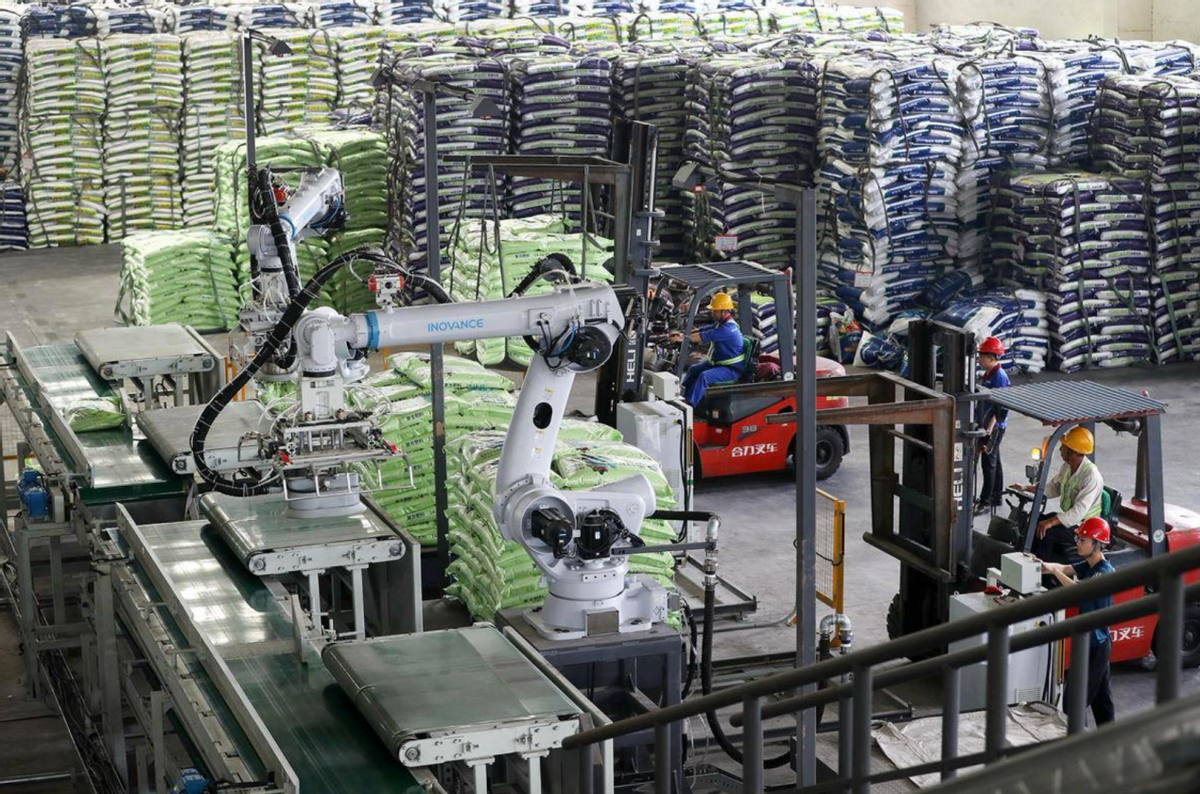 新洋丰荆门总部生产车间内,智能机械手自动码放肥料