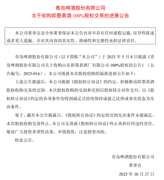 10月27日,青岛啤酒发布最新公告显示,鉴于截至公告披露日,《股权转让协议》约定的交割先决条件未能满足,本次股权收购交易终止,本公司无须就《股权转让协议》终止承担任何违约责任。
