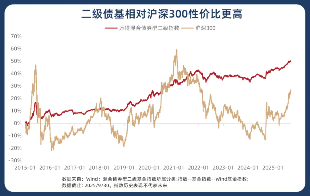 过去十年里(2015-2025Q3),混合型二级债基指数整体涨幅达到53.26%,年化波动率只有4.9%;远优于同期沪深300指数31.33%的涨幅,以及20.5%的波动率。(数据来自:Wind,截至2025/9/30,指数过往业绩不预示未来表现)
