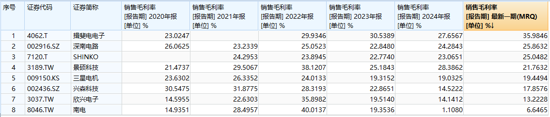兴森科技 (002436.SZ): 表现出了一定的周期性,毛利率从30%的高点回落至17.86%,但仍好于台湾的欣兴和南电。